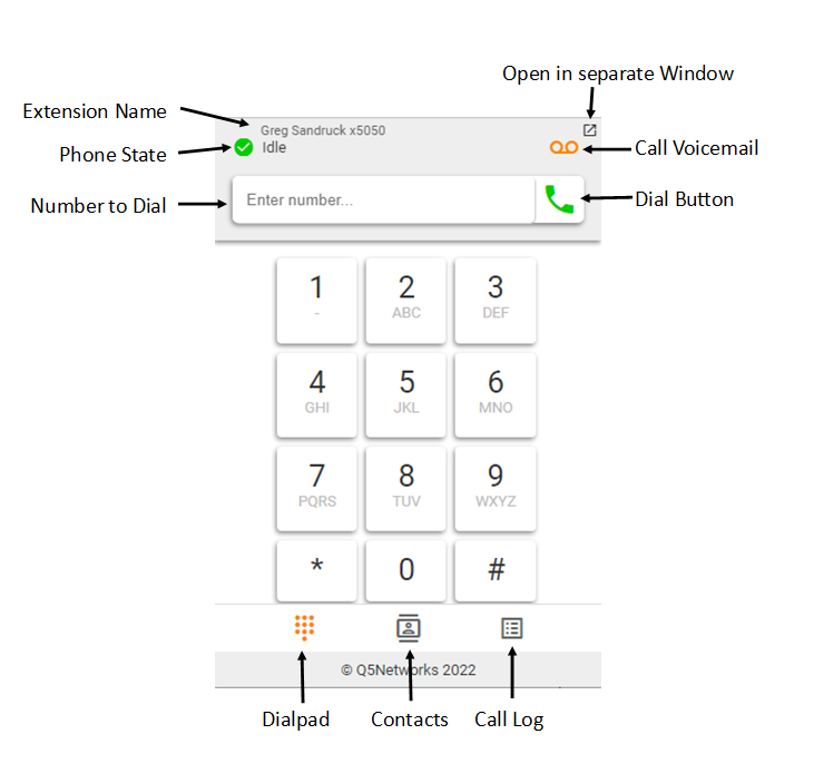 - Once the GUI is open, you can either enter the phone number using your keyboard in the "Enter number..." field, or use your mouse to dial the number on the keypad. To send the call, press the Green "Send" button.