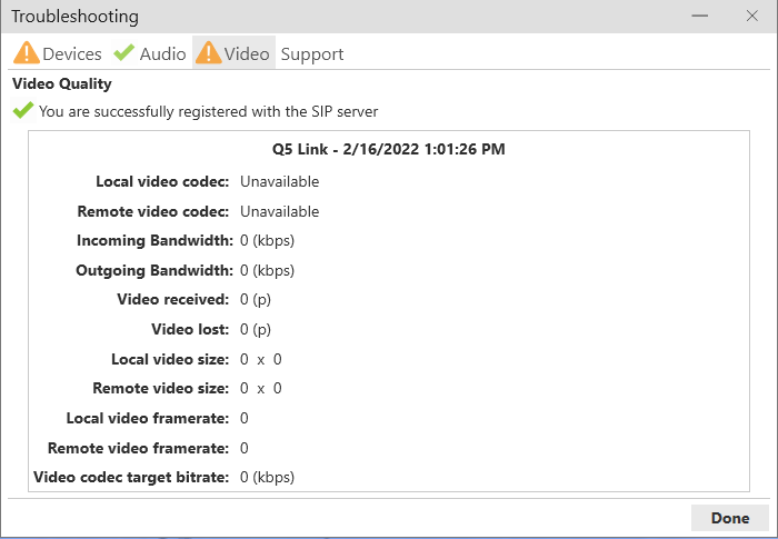 Use the Troubleshooting window in Q5 Link to make sure your headsets and speaker are working. Go to Help > Troubleshooting to display the Troubleshooting window.