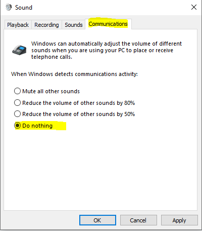 Select the Communications tab and select the Do Nothing radio button.